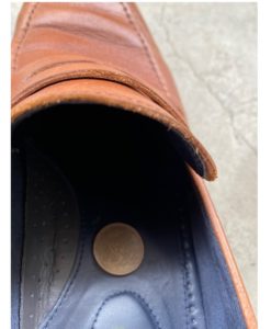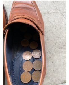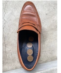 抗菌作用のある10円玉を履き終わった革靴の中に入れ、一日寝かすことでニオイが取れているか実験をしてみました。